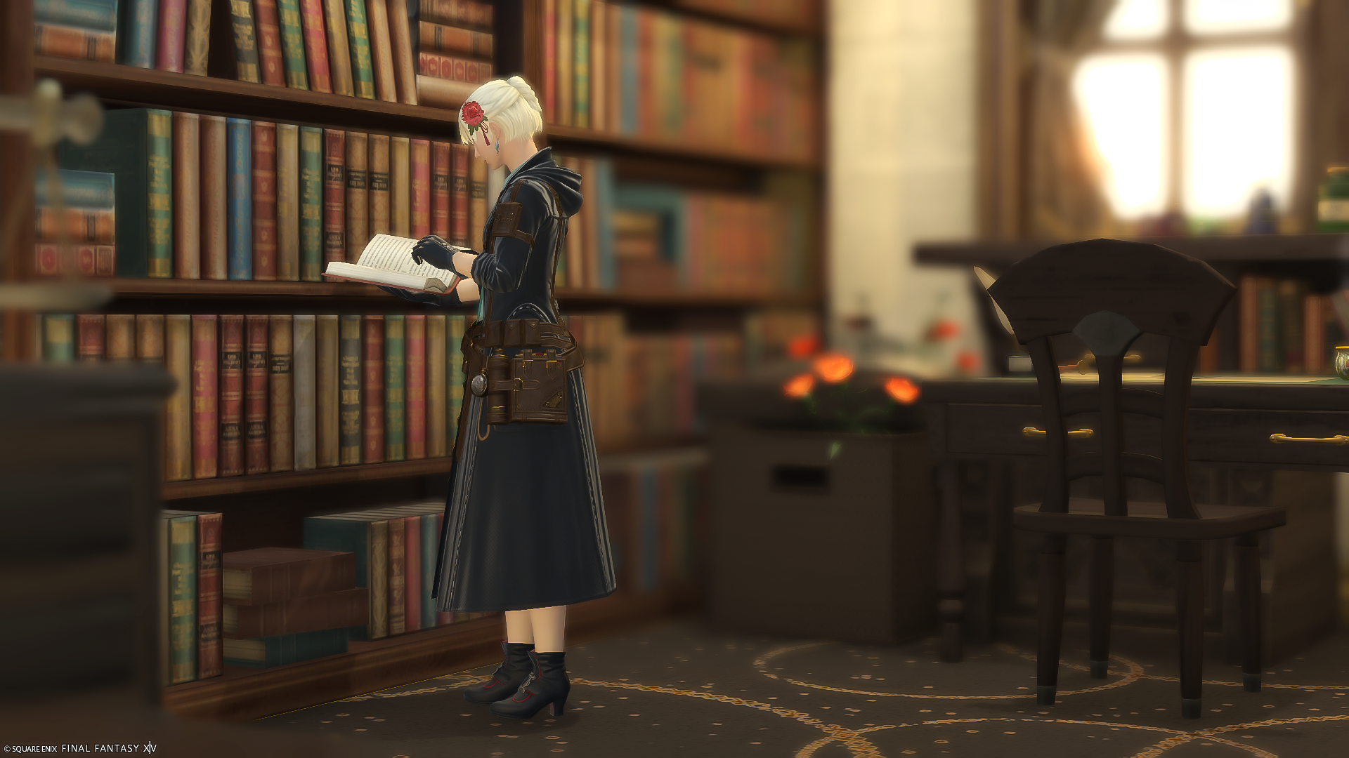 FCハウスの個室はほぼ書庫で、本棚には冒険者として活動するための資料のほかに、愛読書がたくさん詰まっている。資料や論文の他に、随筆や小説も好んで読む。最近のお気に入りは紛争地帯で育ち、暴力を振るうことしか知らなかったミッドランダーの少年が、ひょんなことからウルダハに連れ出され、剣闘士たちが跋扈するコロセウムの世界に足を踏み入れる剣闘群像劇。